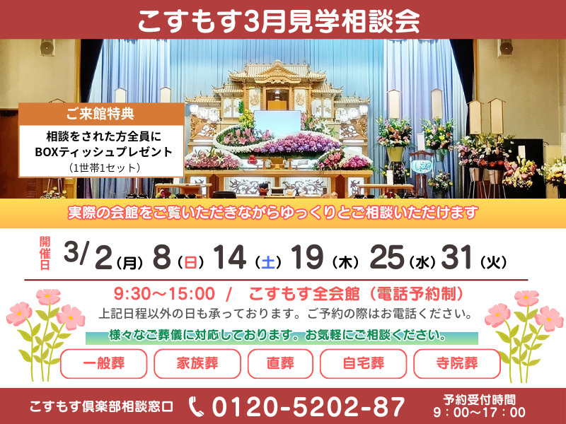 お葬式の疑問やお悩みを事前にご相談をしていただくことで、もしもの時に慌てずスムーズに進めることができます。ぜひお気軽にこすもすホールにお越しください。
