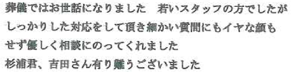 牧之原市‥K様(2025年4月) 葬儀ではお世話になりました 若いスタッフの方でしたがしっかりした対応をして頂き細かい質問にも イヤな顔もせず優しく相談にのってくれました 杉浦君、吉田さん有り難うございました (施行会館:こすもすホールさがら) こすもすホールさがら