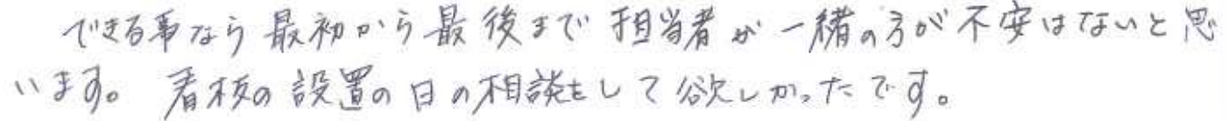 牧之原市‥S様(2025年12月) できる事なら最初から最後まで担当者が一緒の方が不安はないと思います。 看板の設置の日の相談をして欲しかったです。 (施行会館:こすもすホールはいばら) こすもすホールはいばら
